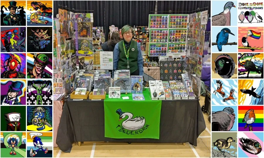 In 2026, I’ve branched out to Comic Cons across the north of England. Find me in Artist Alley where you can purchase Fan Art prints, badges, stickers, bookmarks, customisable keyrings and my comic. I also sell whimsical bird and pride animal prints. Fan Art prints are only available at Comic Cons, they are not for sale online.